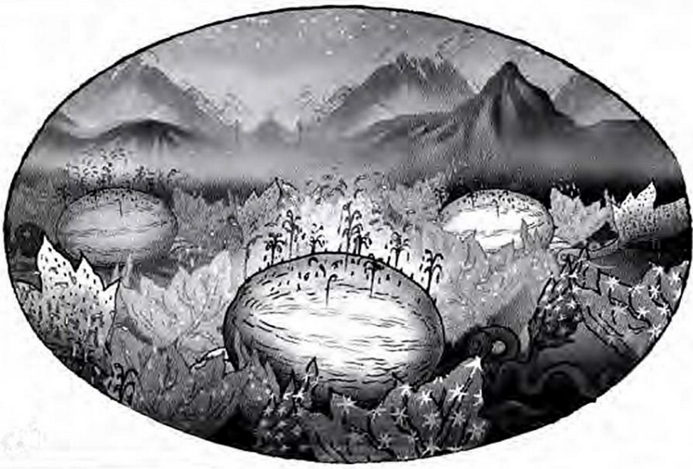 4 Ljudje, ki naravno živijo na strani obrnjeni od planeta, so razumljivo veliko manjši kot tisti na planetu in so na manjših lunah komaj tako veliki kot Zemljani. – Na večjih, zadnjih ali najbolj zunanjih treh lunah pa so večji od ljudi na Zemlji.