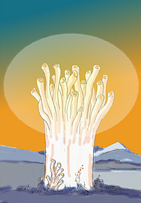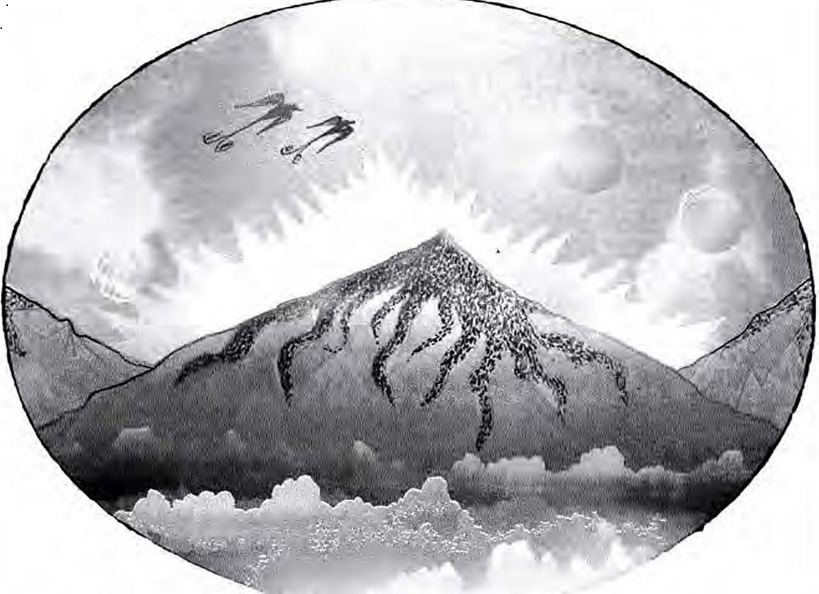 8 Mogoče bi tudi radi vedeli, zakaj ima to drevo prav obliko lijaka? Lijakasta oblika je temu drevesu lastna zato, da drevo z lijakom lahko učinkovito zbira sončno svetlobo in s tem tudi elektromagnetni fluid. Sredi lijaka so posebne cevčice, iz katerih zlasti ponoči izhaja prava megla. Ta megla je za druge rastline in tudi za ljudi, če bi jo vdihavali, nekoliko strupena in škodljiva, dokler je ne razgradi sončna svetloba. Toda lijak je ustvarjen tako, da omenjena megla ne more prenikati iz njega in je izpari le toliko, kolikor je ponoči nujno za oploditev drevesa in to samo tako dolgo, dokler sadež ni napol zrel. Ko se to zgodi, se omenjene cevčice v lijaku zaprejo in hlapi izpuhtijo, da bi se lahko sadeži primerno napihnili; lijak vsebuje takšen hranilni življenjski zrak, da se ljudje povzpnejo nanj na primernih lestvah, se v njem utaborijo in dalj časa tam prenočujejo.