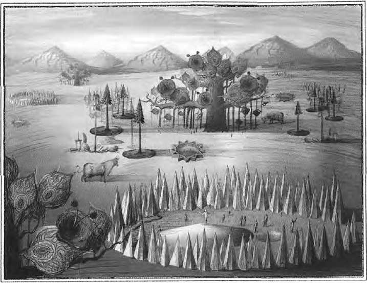 11 Tudi pri tem drevesu vam mora nekoliko priskočiti na pomoč vaša domišljija in zagotovo boste ugotovili, da je, če odštejemo veliko krasoto tega drevesa, njegova svetloba veliko bolj učinkovita kot vse vaše plinske svetilke, če bi jih vse združili na enem kraju, v svetlobnem stolpu, zgrajenem v ta namen. Prav zares, če bi takšno drevo hoteli zasaditi na kakšnem vam bližnjem hribu, ne bi osvetljevalo samo vašega mesta kot deset polnih lun, temveč bi v zadostni bleščavi uživala vsa pokrajina. Pomislite, kakšna svetloba je to, če je na tisoče takšnih dreves raztresenih po deželi! Če vas že vaša rdeča zlo znosna svetloba ognja poživi v temni noči, kako bi vas šele poživila takšna nežna bela luč. Toda za Zemljo takšna drevesa niso predvidena, čeprav je nekaj podobnega mogoče najti na Jutrovem in sicer na nekaterih območjih Kavkaza; tam ni treba drugega kakor vzeti trst ali kakšen porozen kos lesa in ga potisniti v tla, ga na vrhu prižgati in nato sam gori naprej kot plamenica, ne da bi ogenj poškodoval les ali cev - le da so ti plameni rdečkasti in tudi zelo pečejo.