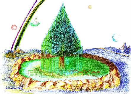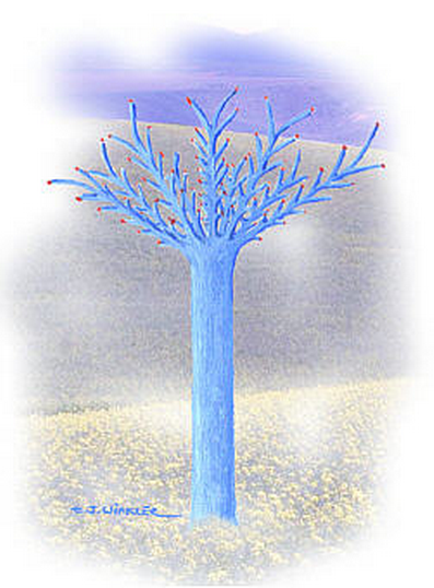 12 To drevo sodi med iglavce in njegovi listi so precej podobni, čeprav v zelo povečanem merilu, iglicam vaših smrek, le da niso zeleni. temveč modri. To drevo je tako izredno pomembno za čiščenje in polnjenje zraka z življenjskimi snovmi, da sega zdravilna moč iz vrhov in vej tega drevesa celo dol do vaše Zemlje. In vaši balzamično dišeči iglavci prejemajo svojo eterično snov predvsem od njih.
