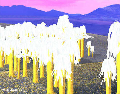 15 Potem velja omeniti še belo lasasto drevo, ki ga tam imenujejo Kiup. To je prav tako pokončno, neredko doseže višino tridesetih klafter (7*) in je v skladu z razmerami povsem okroglo. Vej nima, iz drevesnega vrha pa poganjajo nekakšne srebrnkasto bele niti, ki zaradi svoje obilnosti oblikujejo velik sveženj. Lasje, pravzaprav niti sežejo navzdol, pogosto do polovice drevesa in obdajo deblo nekaj klafter široko. Ko zaveje veter in tudi, ko mirujejo, so videti čudovite. Pri gozdu takšnih dreves je videti, kot bi drevje povsem prekrival sneg. Odpadle »lase« ljudje skrbno zbirajo, iz njih izdelujejo nekakšno platno, ki je zelo prožno, mehko in vzdržljivo. To je skoraj vsa korist, ki jo imajo tamkajšnji ljudje od tega drevesa.